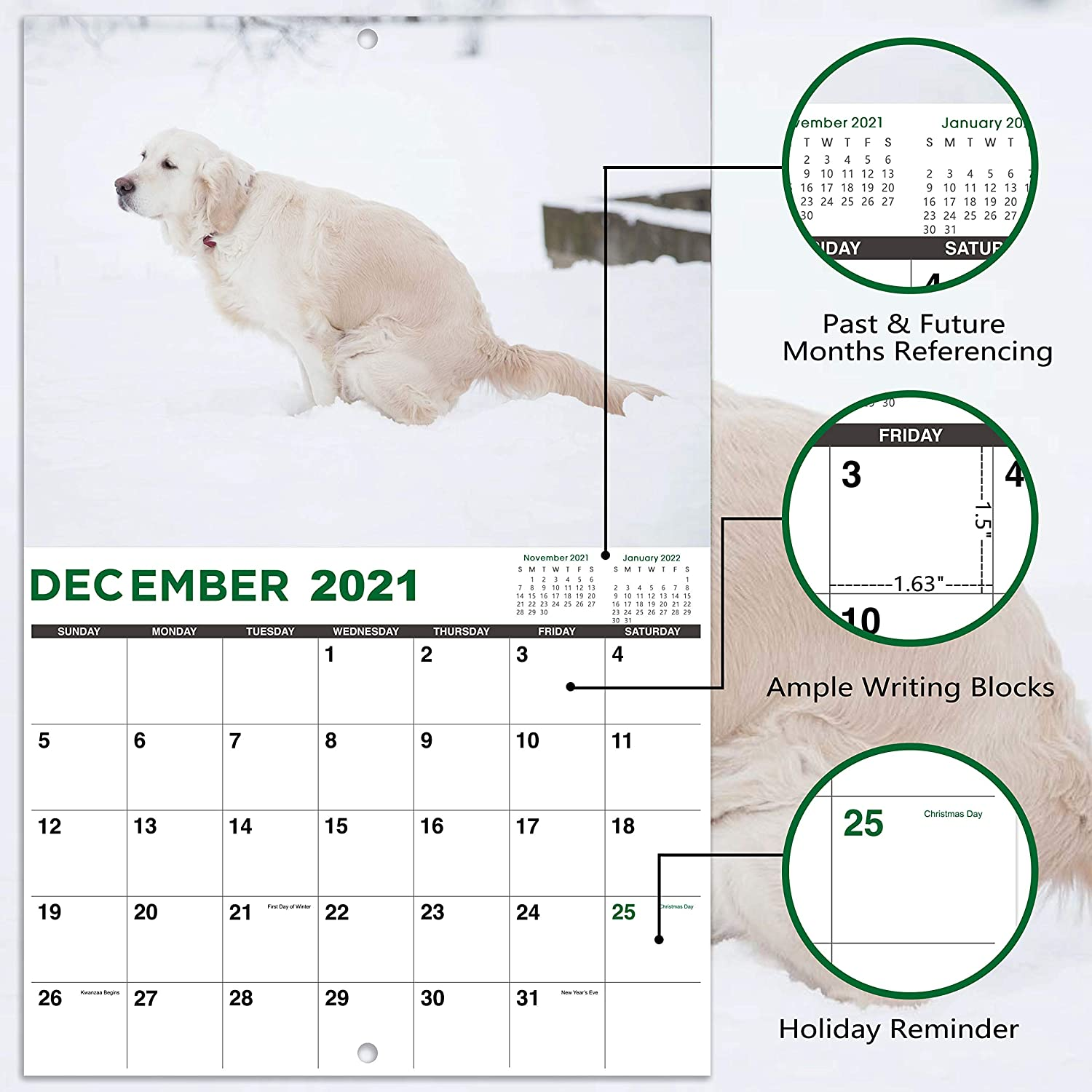 December: The land starts to snow again. This month, owners of white puppies in the house should pay attention. They shit in the snow, and you won't find them if you are not careful.