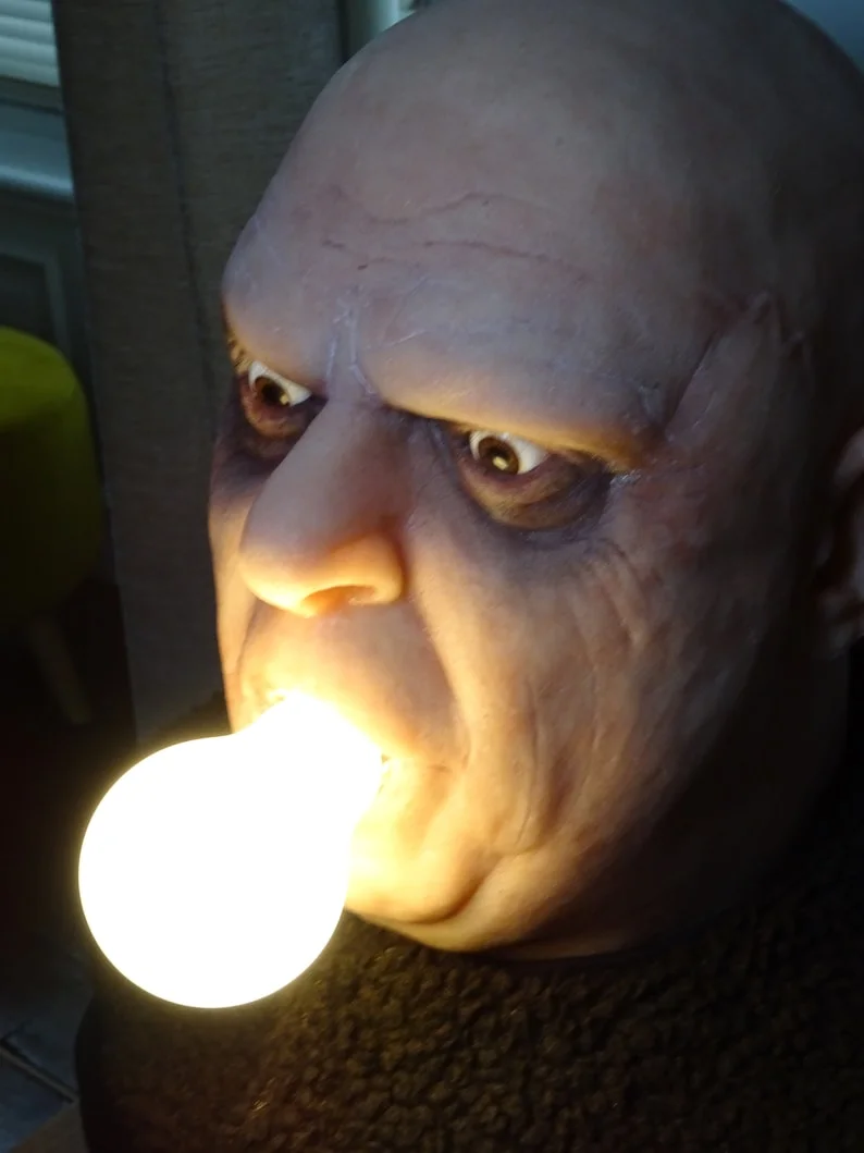 A 1:1 Scale Life Size "Uncle Fester" working lamp, hand made in the image of Jackie Coogan (1964 Addams Family Series). As you can see, the lamp includes the lightbulb in Uncle Fester’s mouth. The character had a talent for putting lightbulbs in his mouth and lighting them up.